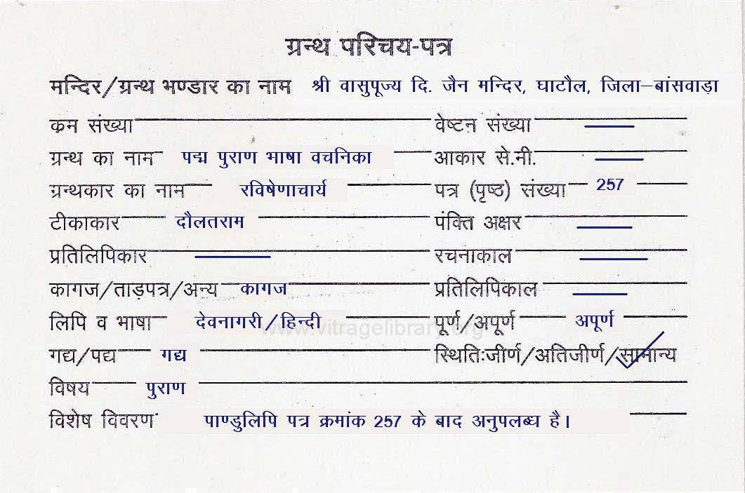 | Granth | : | Aadi Puran Bhasha Vachanika |
