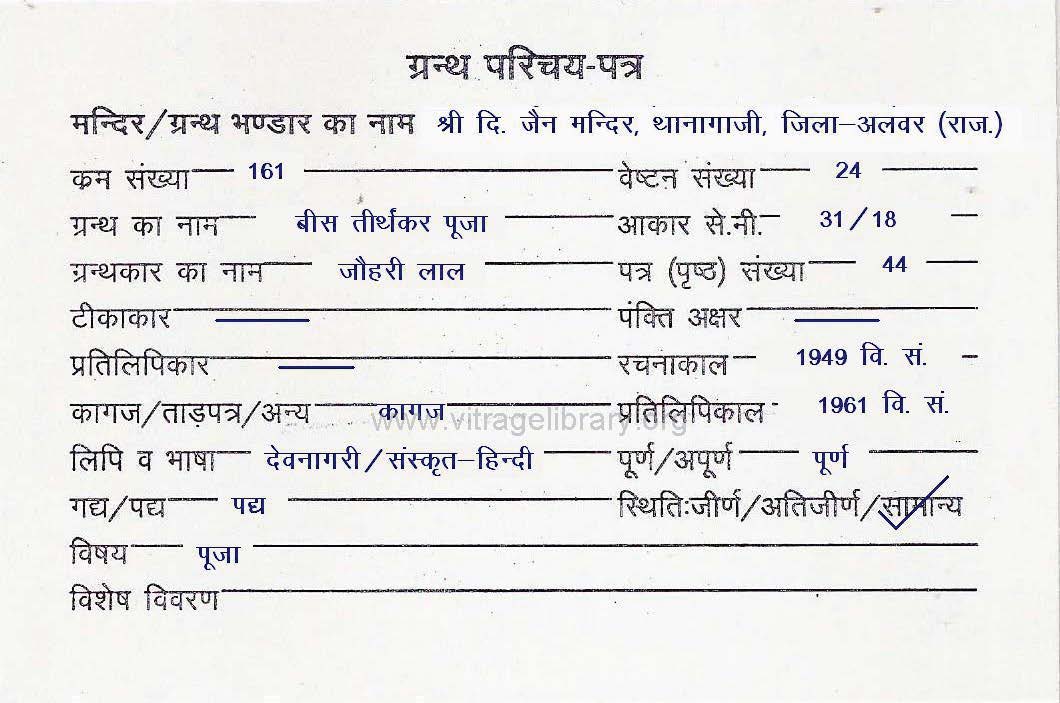 | Granth | : | Bees Teerthankar Puja |