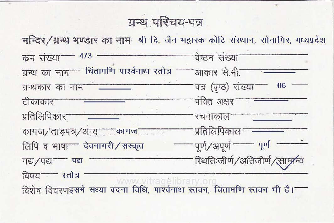 | Comments | : | This contains Sandhyā Vandana Vidhi, Pārśvanātha Stavana, and Cintāmaṇi Stavana. |