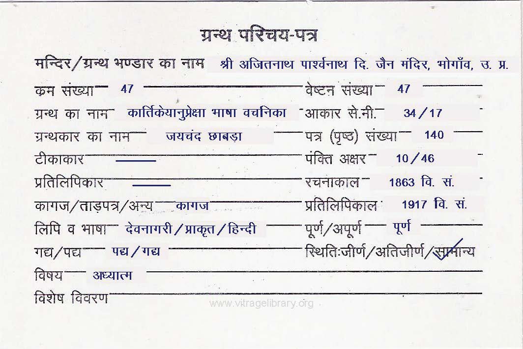 | Granth | : | Kartikeyanupreksha Bhasha Vachanika |