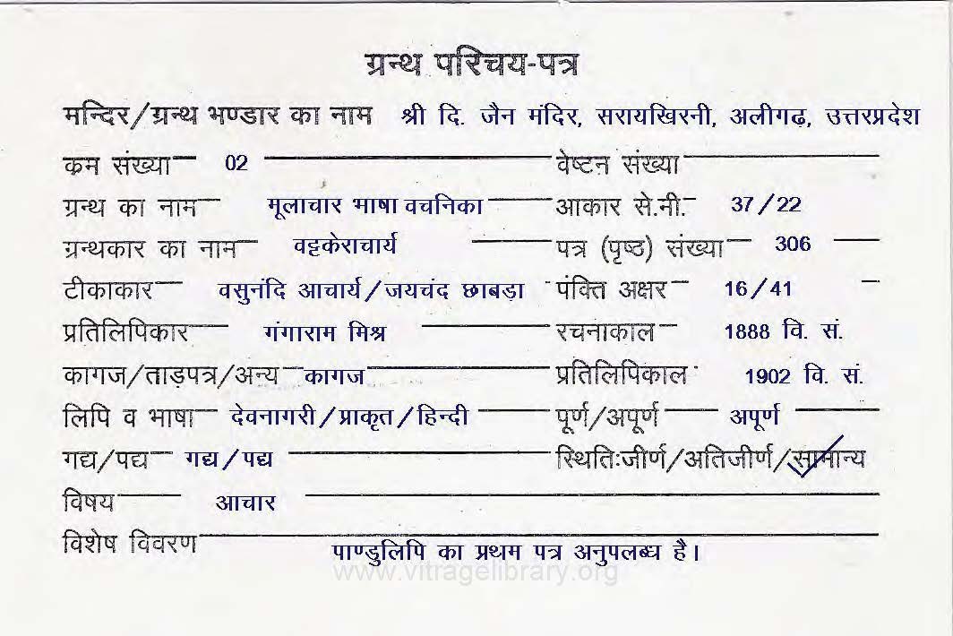 | Granth | : | Mulachar Bhasha Vachanika |
