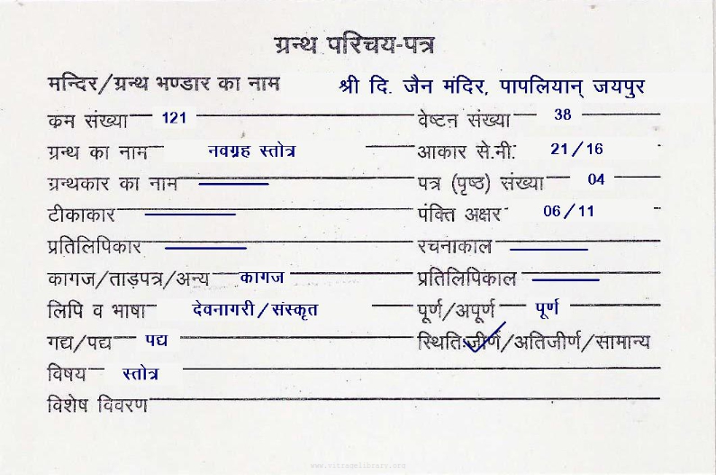 | Comments | : | There are three commendations; Tees Chaubisi Pooja Language, Brahm Vilas, Jambuswami- Raas |