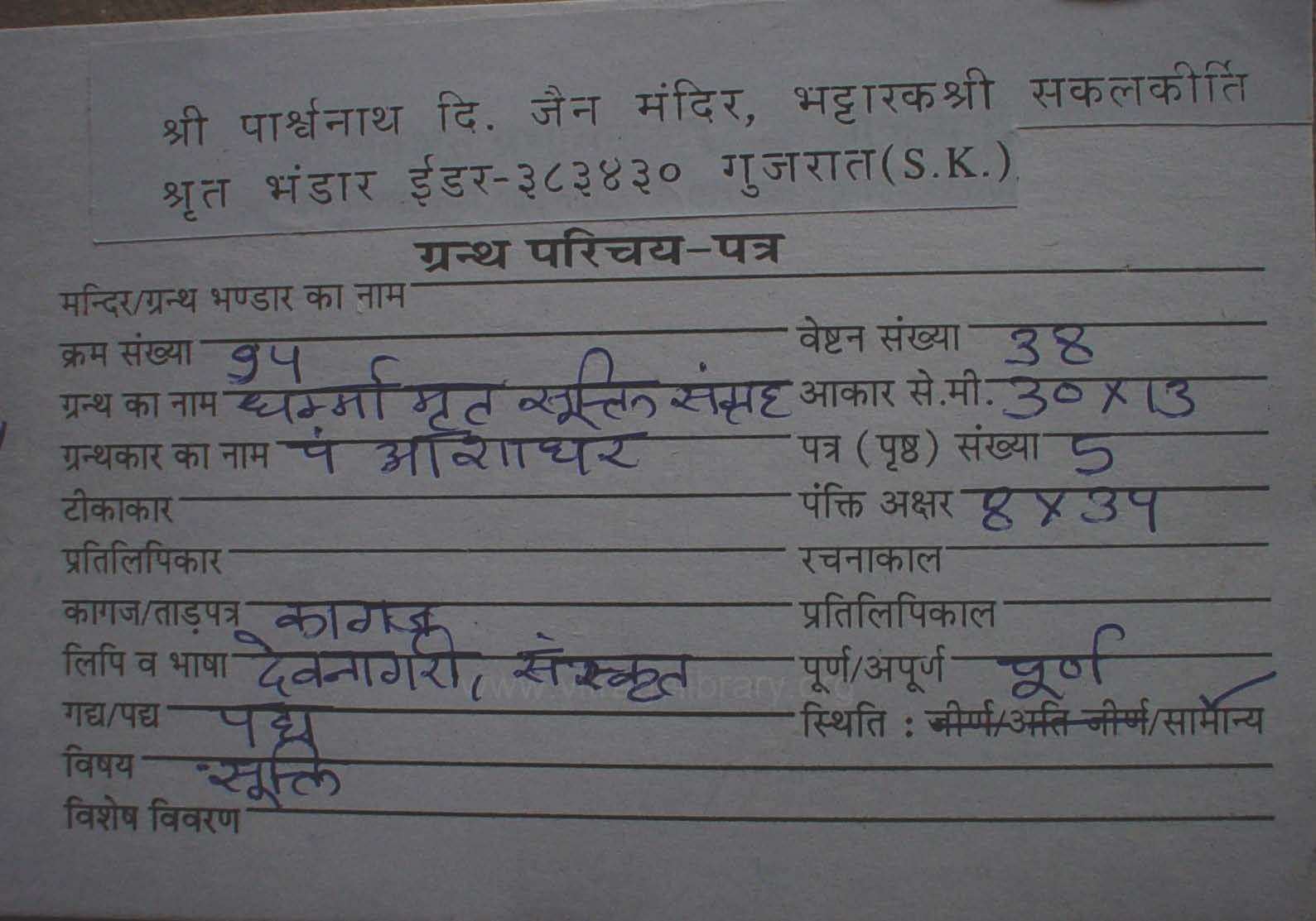 | Source | : | Shree Parshwanath Digambar Jain Mandir, Bhattarak Sakalkirti Shrut Bhandar, Idar (Guj.) |