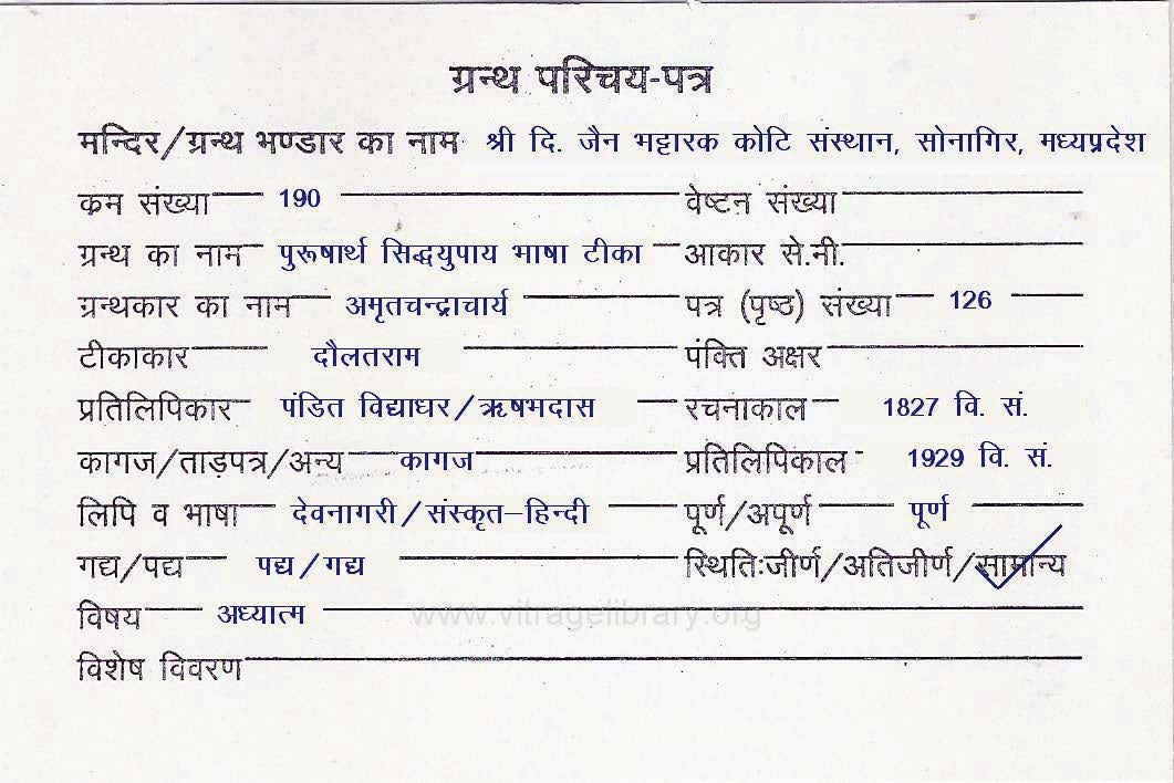 | Granth | : | Purusharth Sidhayupay Bhasha Teeka-1 |