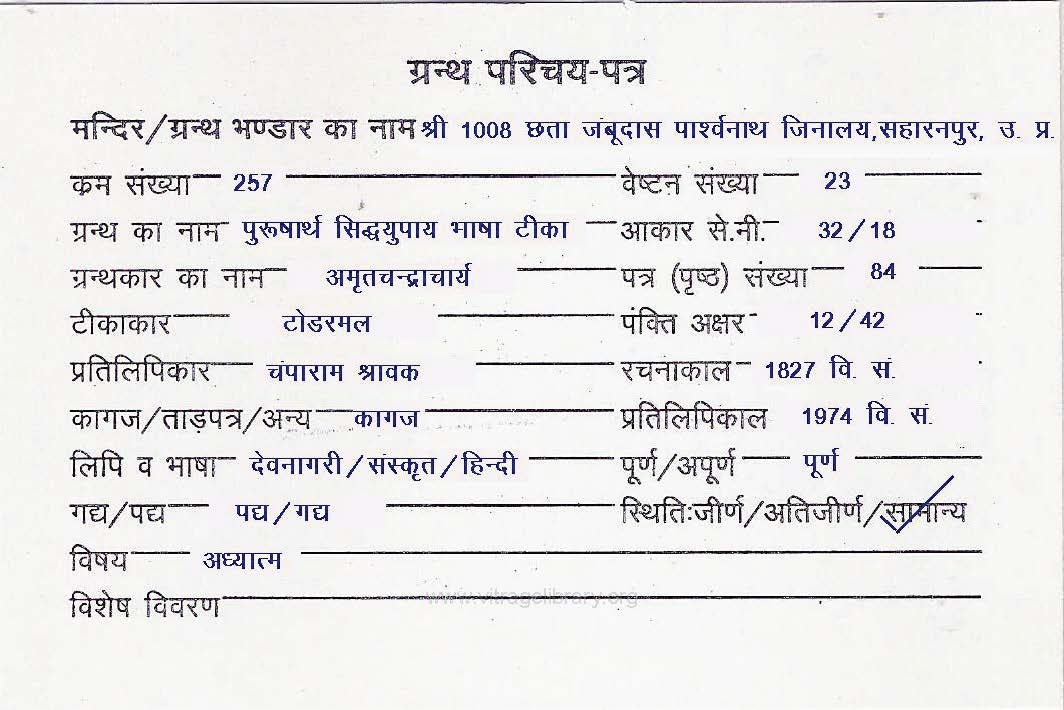 | Granth | : | Purusharth Sidhyupaya Bhasha Teeka |