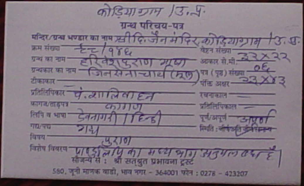 | Comments | : | Bhattarak Dharmakirti wrote the manuscript in his own hand. |